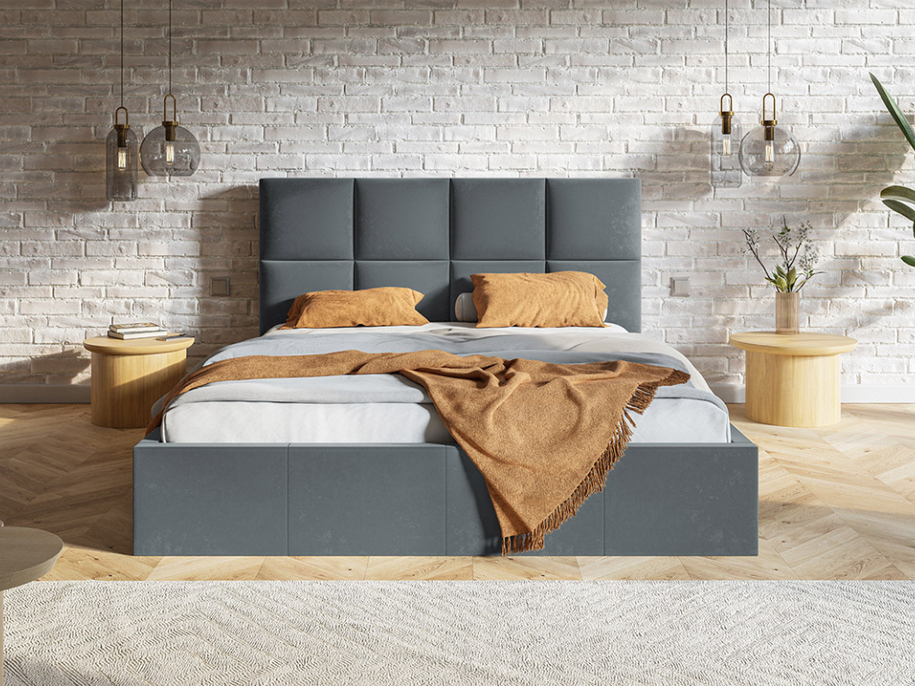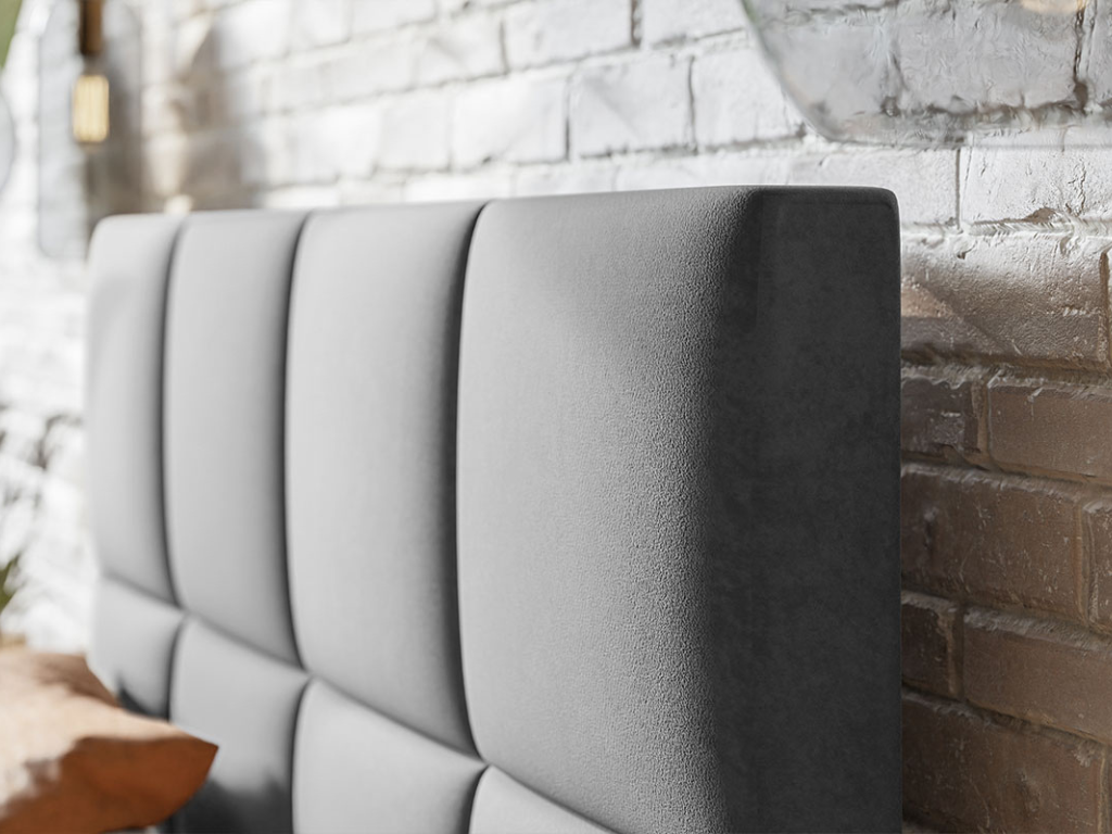 Łóżko obite jest przyjemną w dotyku tkaniną Jasmine typu plusz/zamsz, która nadaje mu miękkości i eleganckiego wyglądu. Wysoki, tapicerowany zagłówek zapewnia komfortowe oparcie podczas czytania czy odpoczynku. Prosta bryła bez nóżek sprawia, że mebel stabilnie spoczywa na podłodze, tworząc harmonijną i nowoczesną całość.
