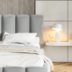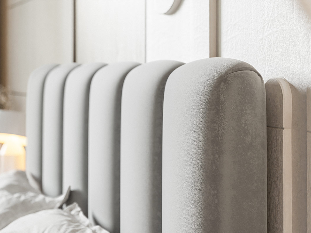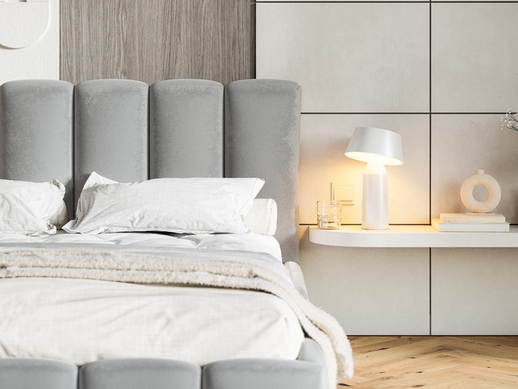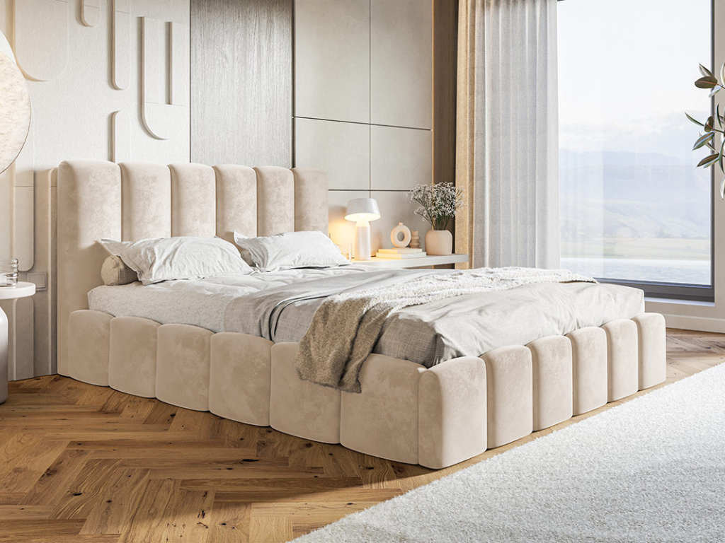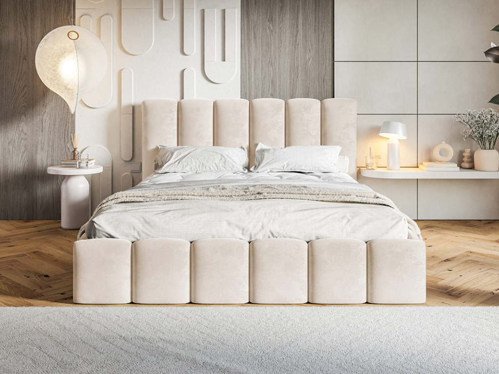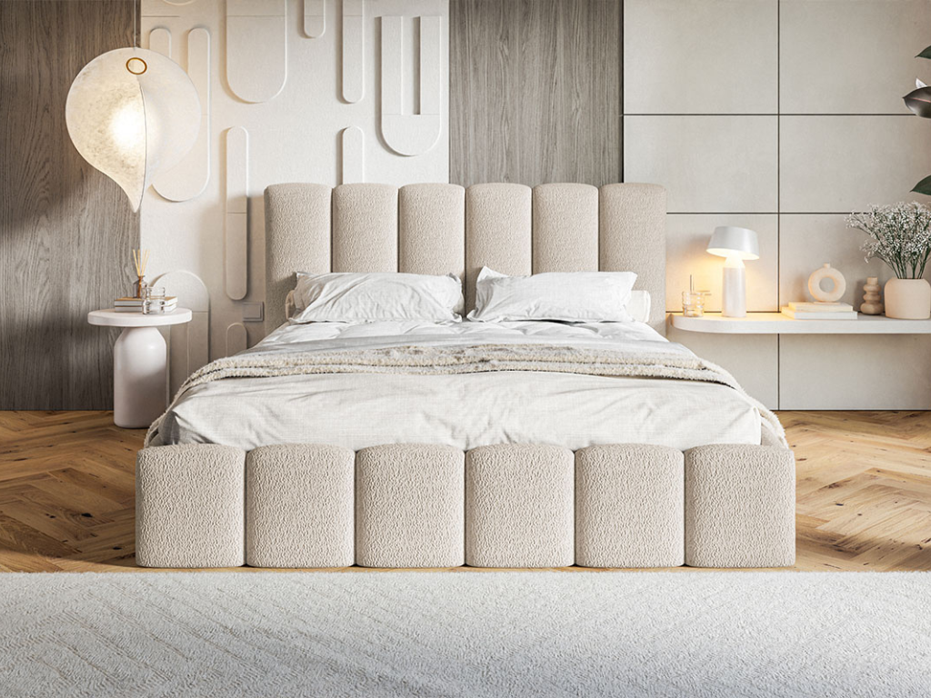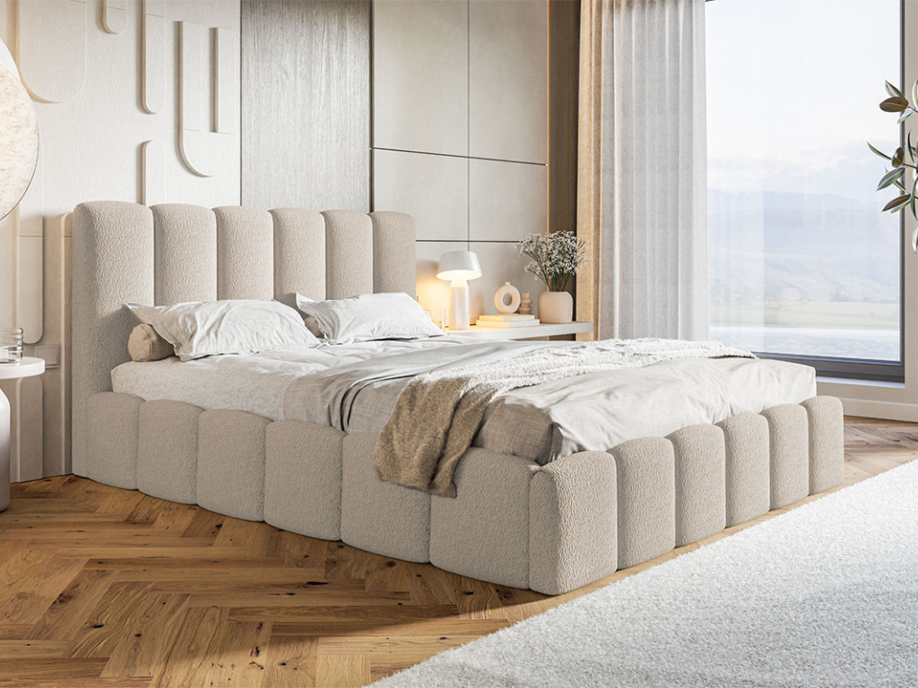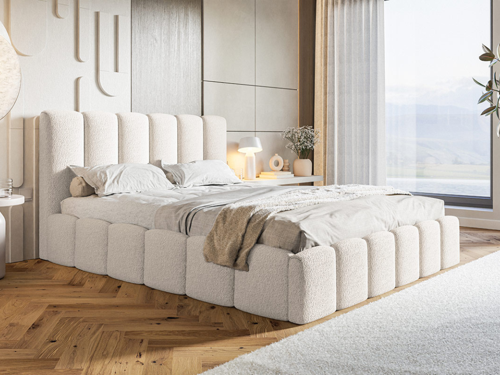 Łóżko obite jest przyjemną w dotyku tkaniną typu bukla/baranek Catch me lub Amor Velvet typu velvet, które nadają mu miękkości i eleganckiego wyglądu. Wysoki zagłówek zapewnia komfortowe oparcie podczas czytania czy odpoczynku. Bryła bez nóżek, z wyraźnie zaakcentowanymi, miękkimi segmentami, sprawia, że mebel prezentuje się nowocześnie i stabilnie spoczywa na podłodze.