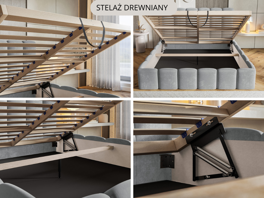 - Stelaż drewniany – podnoszony na podnośnikach sprężynowych, wykonany z ramy ze sklejki i 32 elastycznych listew brzozowych (odstępy ok. 5–5,5 cm), maksymalne obciążenie do 240 kg